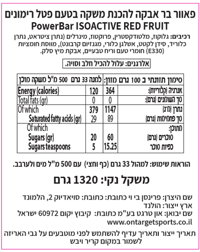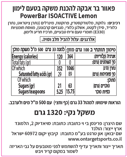 אבקה להכנת משקה איזוטוני בטעם לימון תפקידו של המשקה האיזוטוני הוא החזרת האנרגיה והמלחים לגוף במהלך הפעילות, אבל ניתן לצרוך אותו גם אחרי ולפני הפעילות . בכל מיכל יש 1320 גרם אבקה שמייצרת 20 ליטר משקה מוכן . המשקה מכיל 120 קלוריות למנה עם יחס פחמימות של 2:1 של גלוקוז מול פרוקטוז . המשקה מכיל גם 350 מ"ג נתרן ועוד מלחים נוספים כמו מגנזיום ואשלגן.